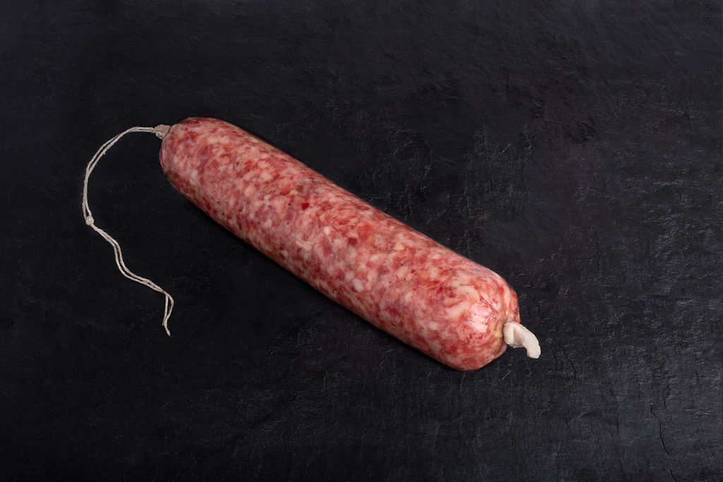 Saucisson à cuire pistaché. Fabrication maison avec notre cochon fermier du Cantal.